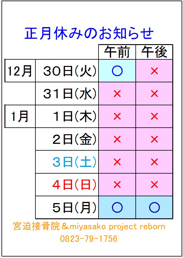 宮迫接骨鍼灸院の診療時間は以下の通りです。