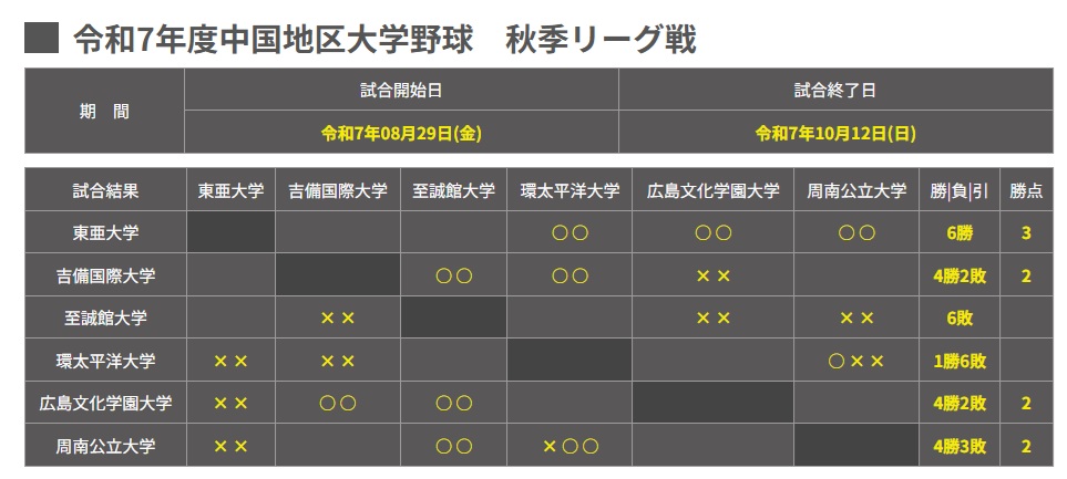 令和7年度 中国地区大学野球 秋季リーグ戦・第四週