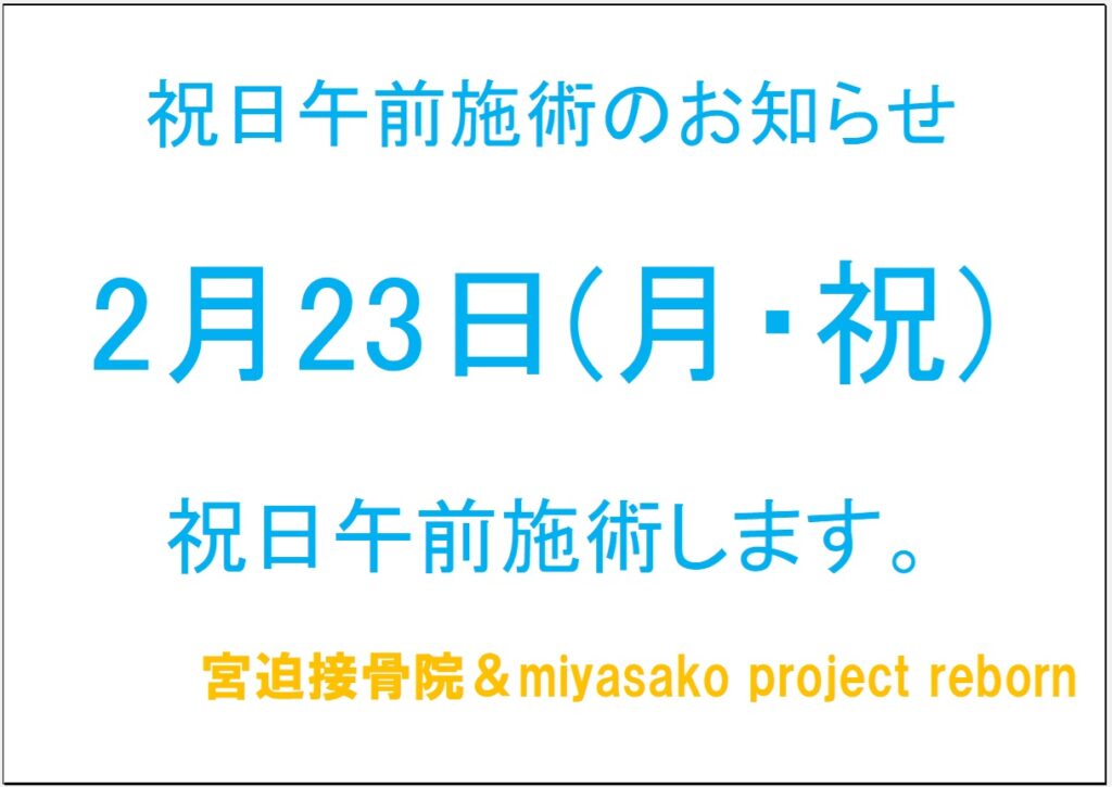 祝日午前施術のお知らせ 来週、2月23日(月)、天皇誕生日で祝日ではありますが・・・ 宮迫接骨院は、午前中施術を行います! 祝日にケガをしたら・・・ 酸素カプセルに入りたい!という方・・・ また、平日、治療したくても時間がない方・・・ ぜひ、祝日午... -