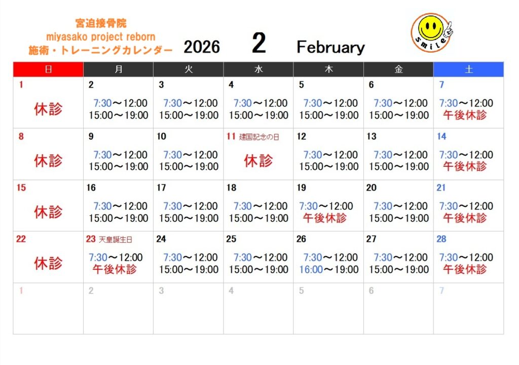 宮迫接骨院 『2月カレンダー』 2月の宮迫接骨院&miyasako project rebornの「施術&トレーニングカレンダー」です。 2月は28日しかなく、祝日も2日あり、平常であれば実日数は22日。 圧倒的に少ない実日数です。 11日の祝日は研修会があり休診ですが、23... -
